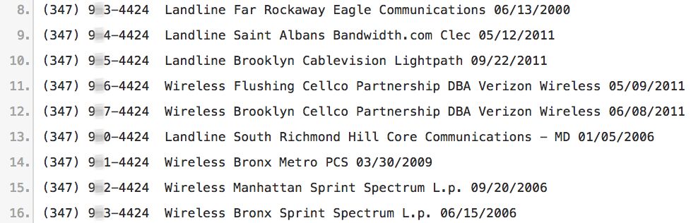 The phone number prefixes (which are the three digits following the area code) would be parsed into a list of possible phone numbers belonging to the target, with number prefixes ranging from 200-999.